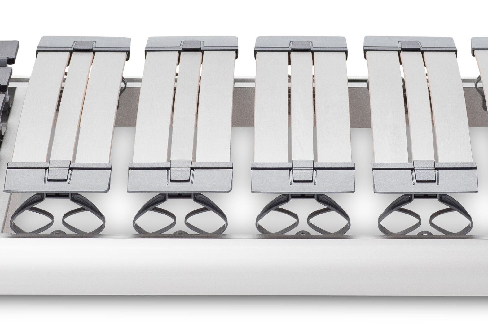 Gelenkfederung: Dynamische Körperanpassung auf ganzer Liegefläche. Drehbare Federelemente mit besonders hoher Einsinktiefe und Buchenholzleisten passen sich an und gleichen Bewegungen aus.
