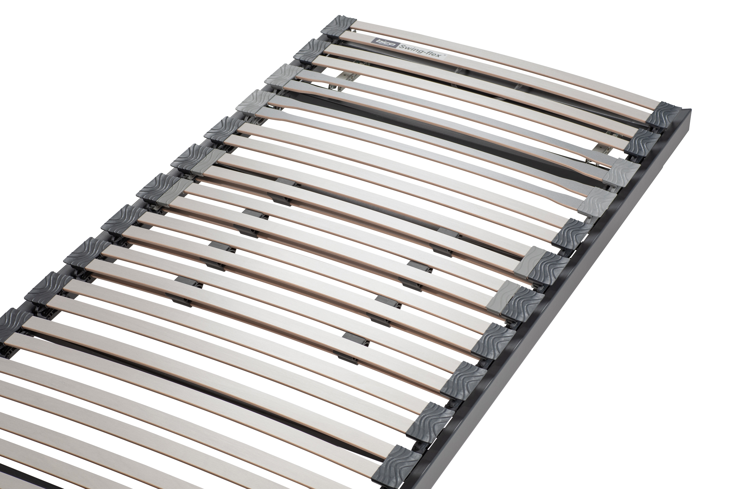 Der Swing-flex® Einlegerahmen verbindet Funktionalität optimal mit Ästhetik. Der moderne, folierte Schichtholzrahmen überzeugt durch sein attraktives Design. Die siebenfach verleimten Buchenholz-Federleisten präsentieren sich mit revolutionärem Querschnitt. Ihr Lendenwirbelbereich lässt sich durch die individuell einstellbaren Lordoseschieber ideal unterstützen. Dank der speziellen Schulterkomfortzone und der einstellbaren Mittelzonenverstärkung geniessen Sie noch mehr Komfort.