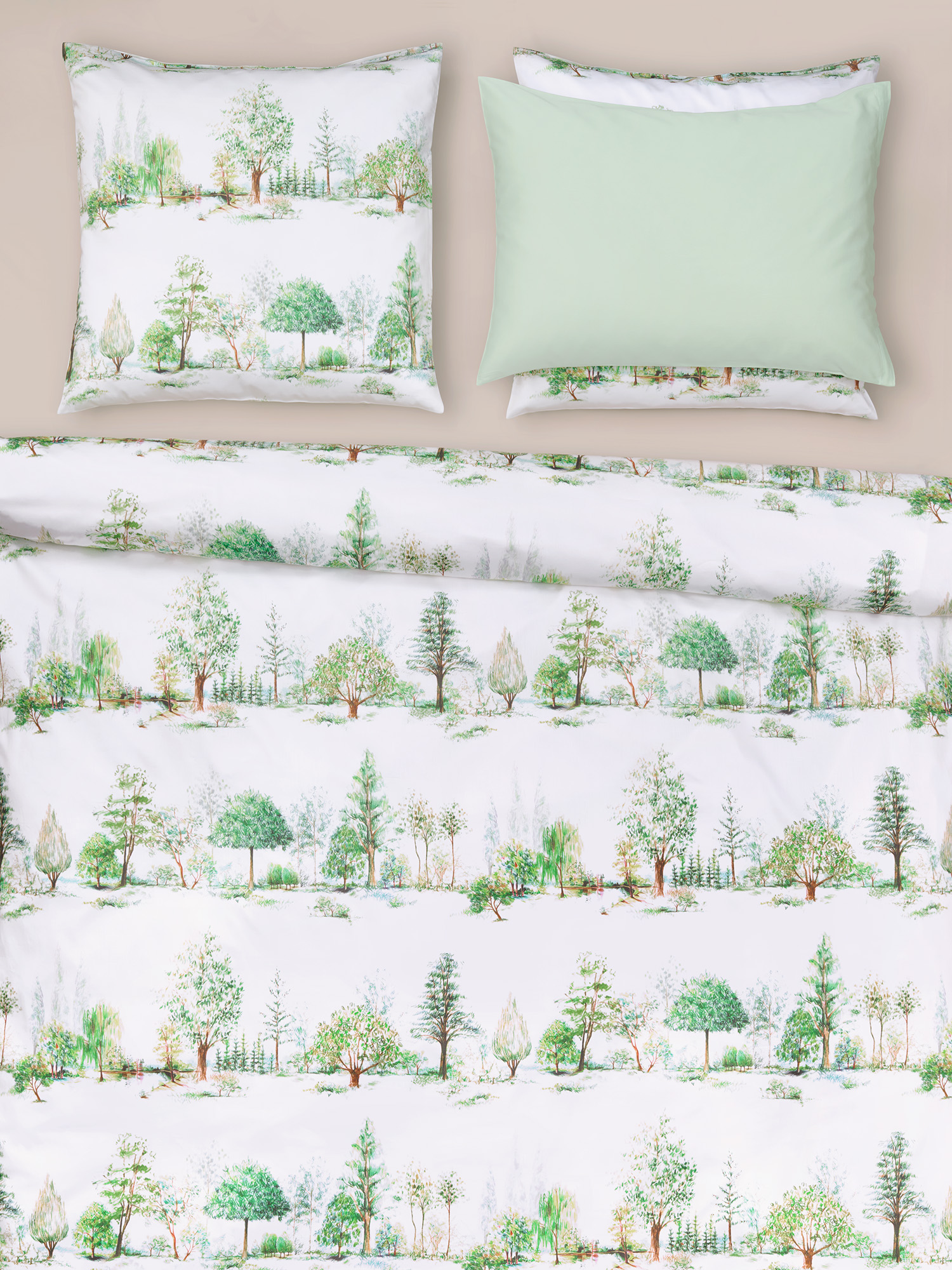 Christian Fischbacher Bettwäsche TREES ist eine Hommage an die Schönheit und Lebenskraft von Bäumen. Die Motive wurden in unserem Atelier Christian Fischbacher von Hand mit Farbstiften gezeichnet und in eleganten Reihen angeordnet. Mittels moderner Drucktechnologie werden die detaillierten Schraffuren in einer reichen Grünpalette auf unserem weißen Christian Fischbacher Baumwollsatin gedruckt.