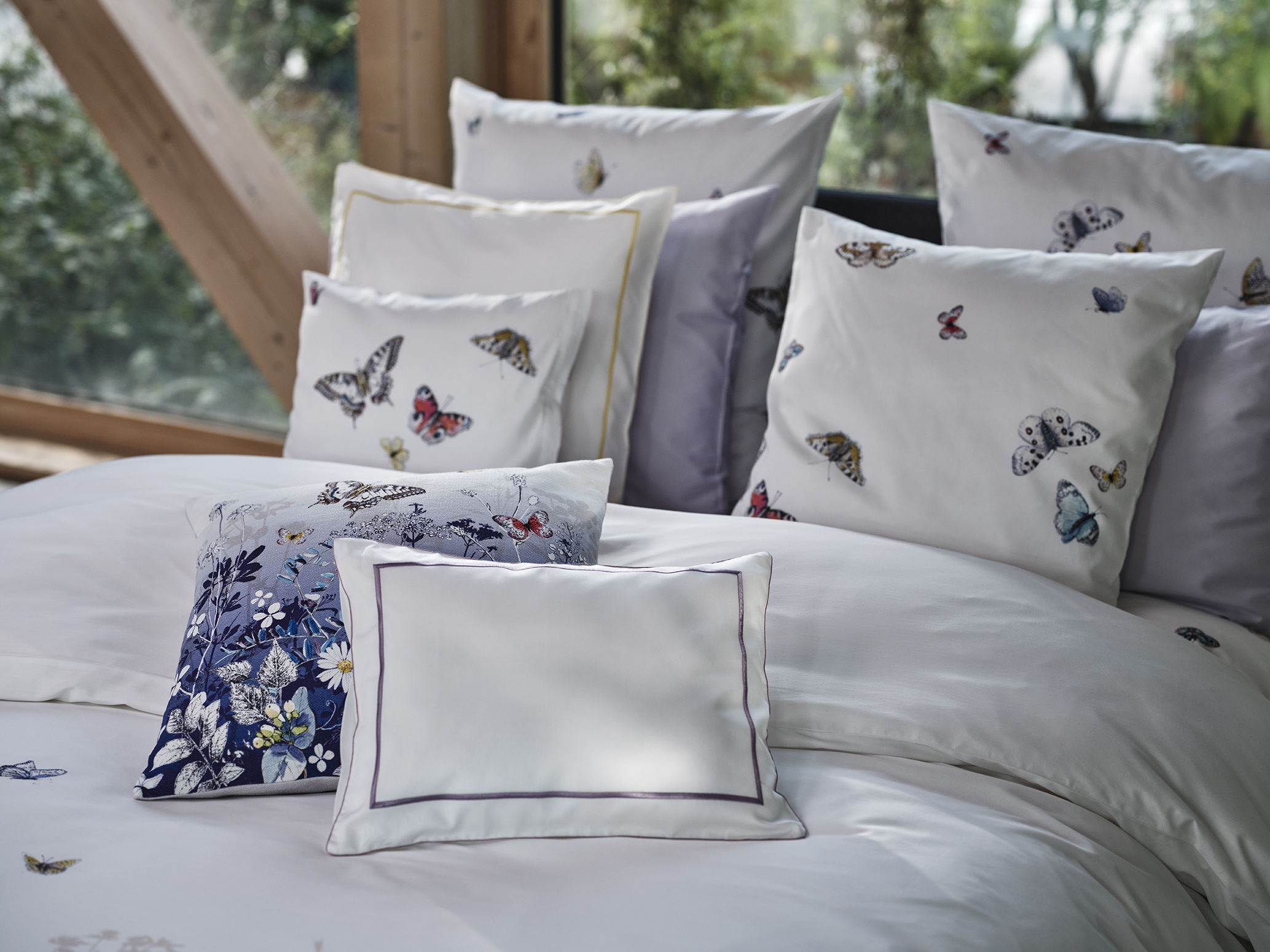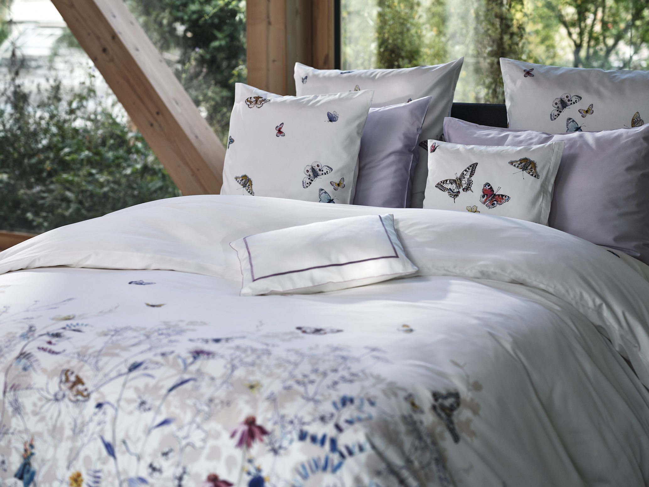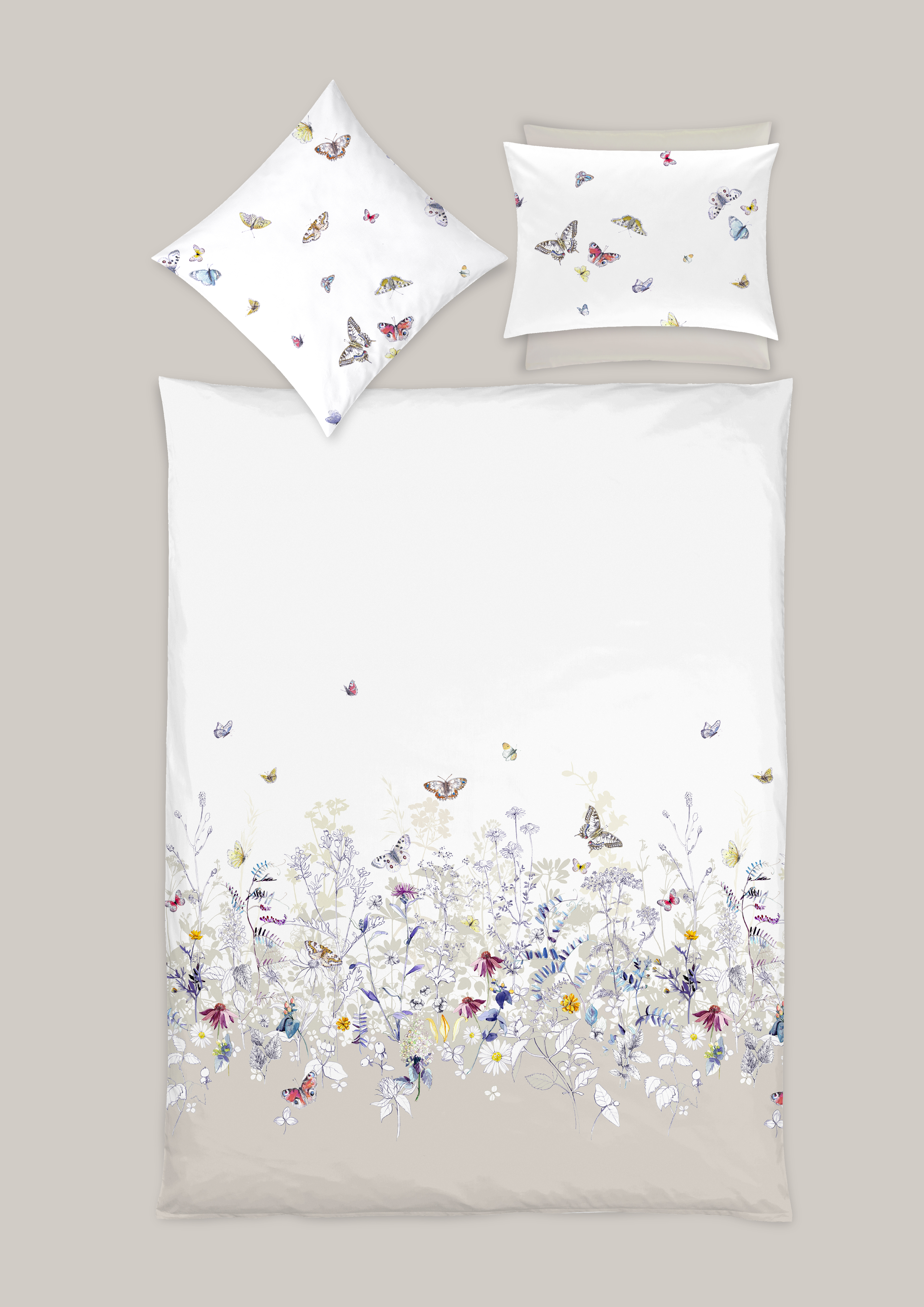 Ein sanfter Wind bringt den Frühling und lässt die Pflanzenbordüre aus Sonnenhut, Zinnien, Margeriten und Johanniskraut erblühen. Über dieser Vielfalt schweben Schmetterlinge in leuchtenden Farben. AVIVA lässt von einer idyllischen Frühlingslandschaft träumen, die als Panneau mit eleganten Pflanzenzeichnungen auf beigem Fond nach oben in einen weissen Hintergrund übergeht.