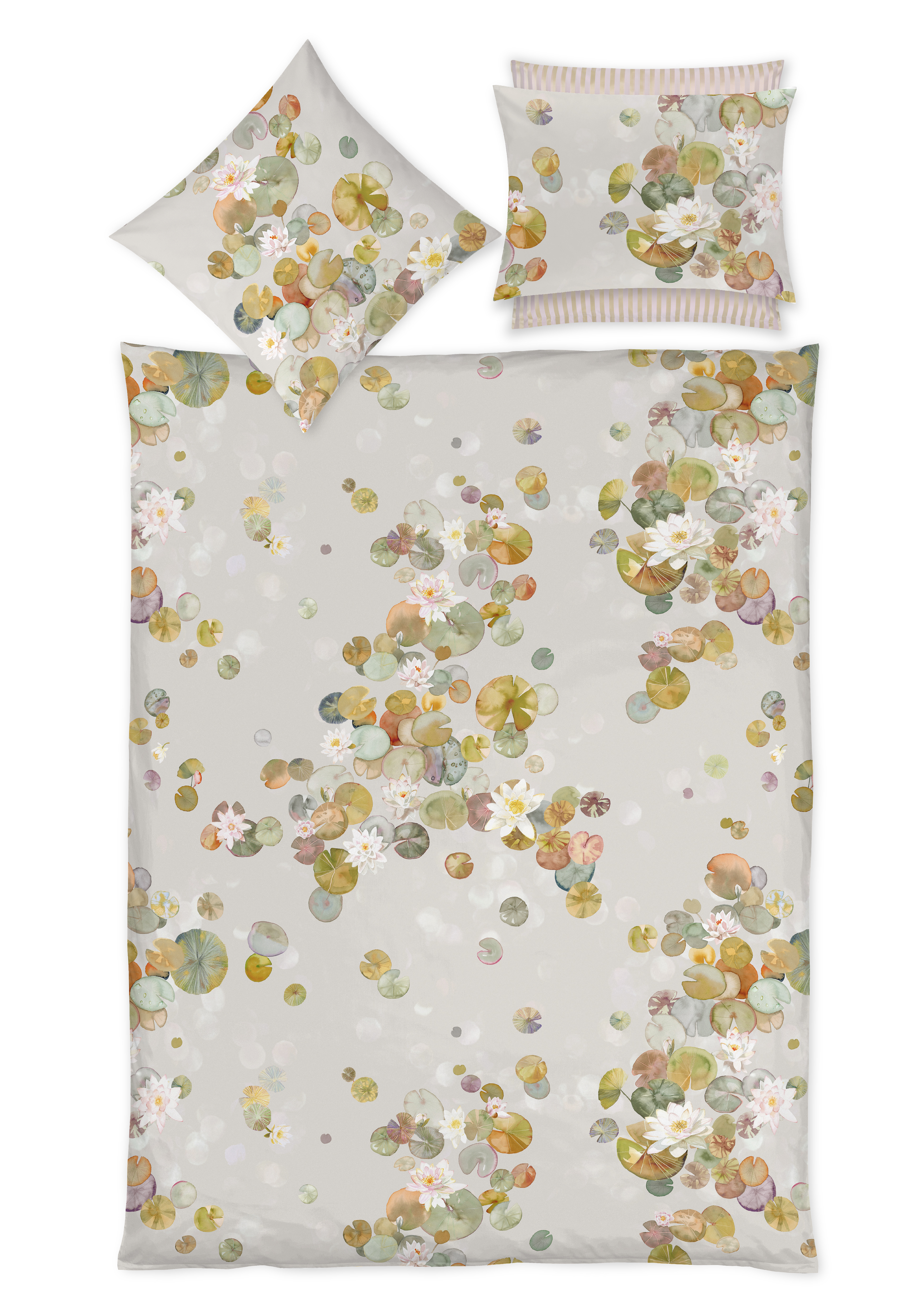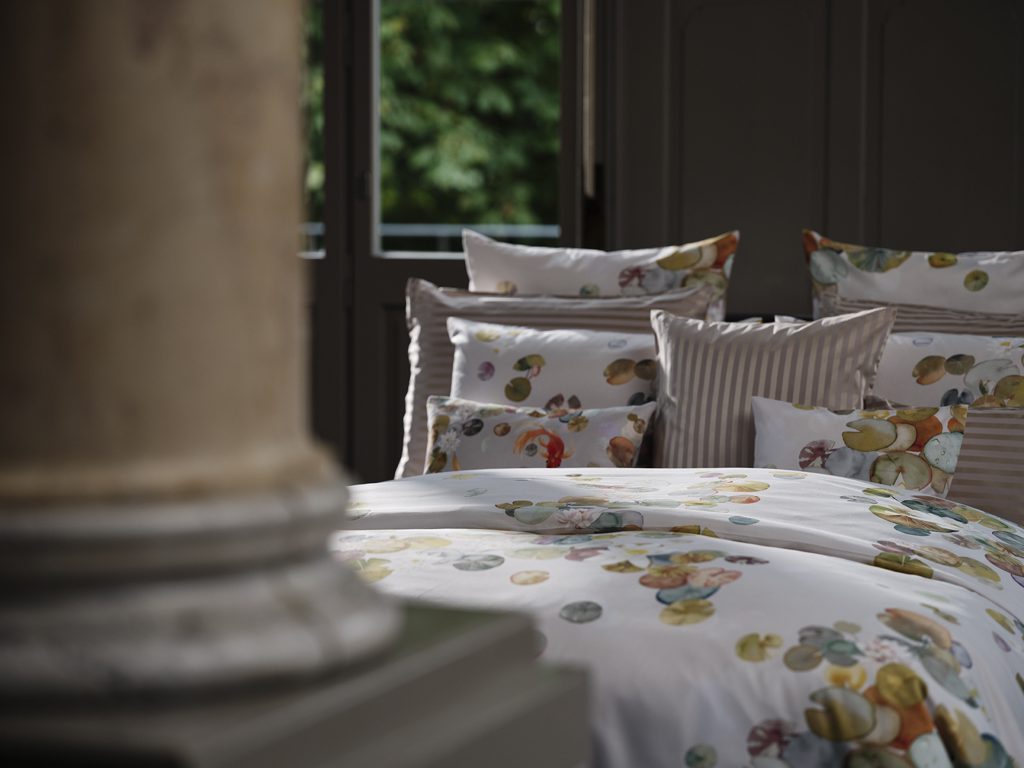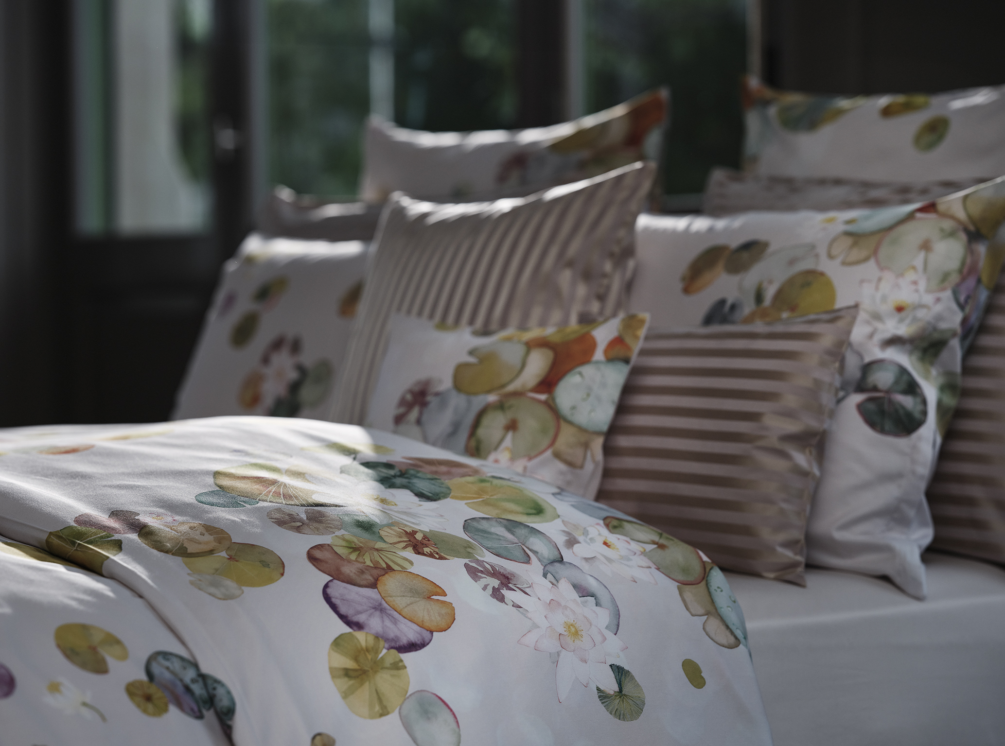 Wie auf der spiegelnden Oberfläche eines stillen Sees entfalten sich aquarellierte Seerosenblätter und -blüten in zarten Grün-, Gold- und Apricottönen auf changierendem, beige-glänzendem Satin. Das sanfte Farbspiel und die fliessenden Formen verleihen dem Design eine natürliche Harmonie und eine beruhigende Leichtigkeit. Aus der Vogelperspektive erscheinen die Seerosenblätter als grosszügige Punkte, die sich zu Ornamenten verdichten. Diese Verteilung verleiht dem Design eine moderne Formensprache.