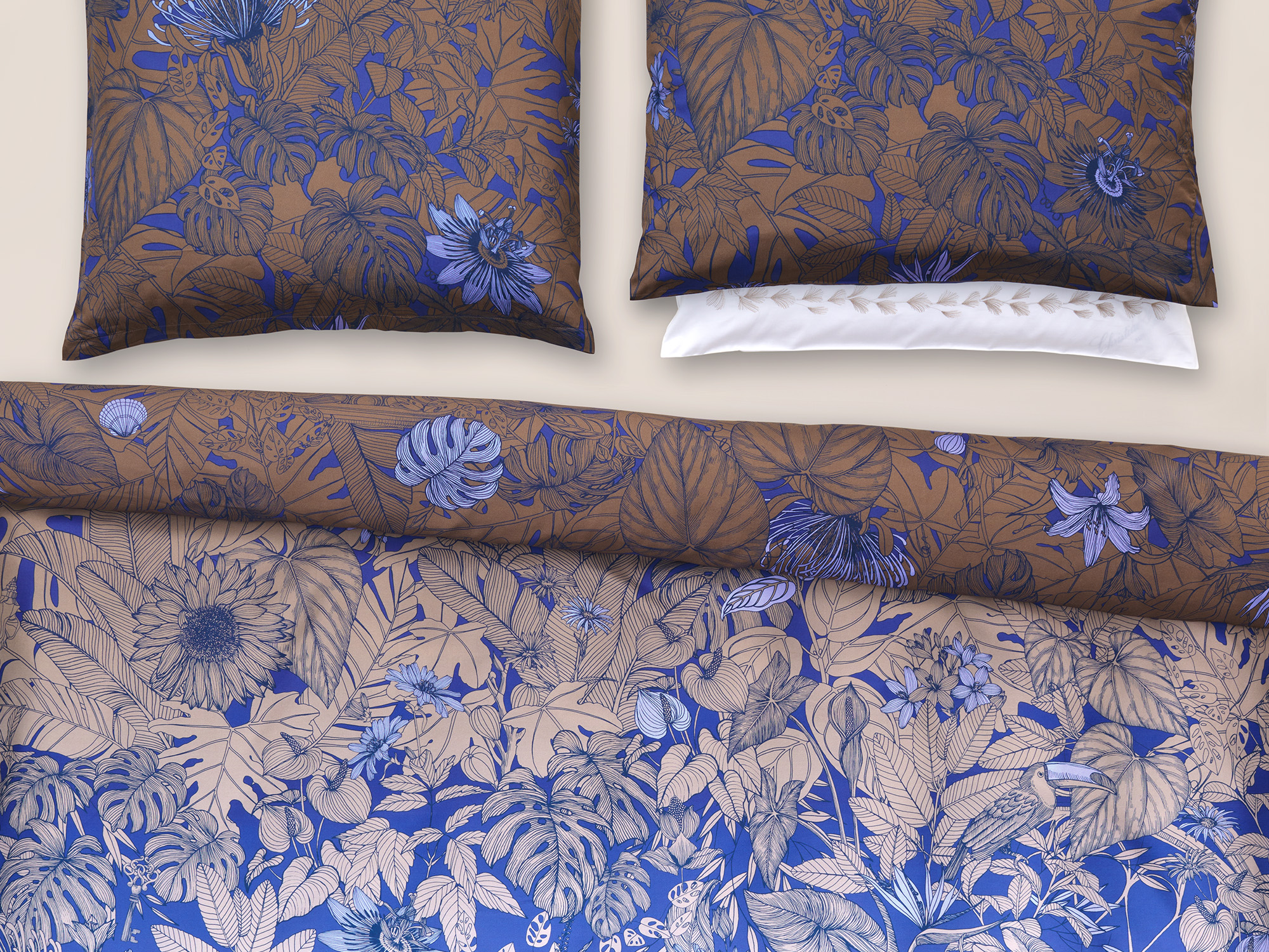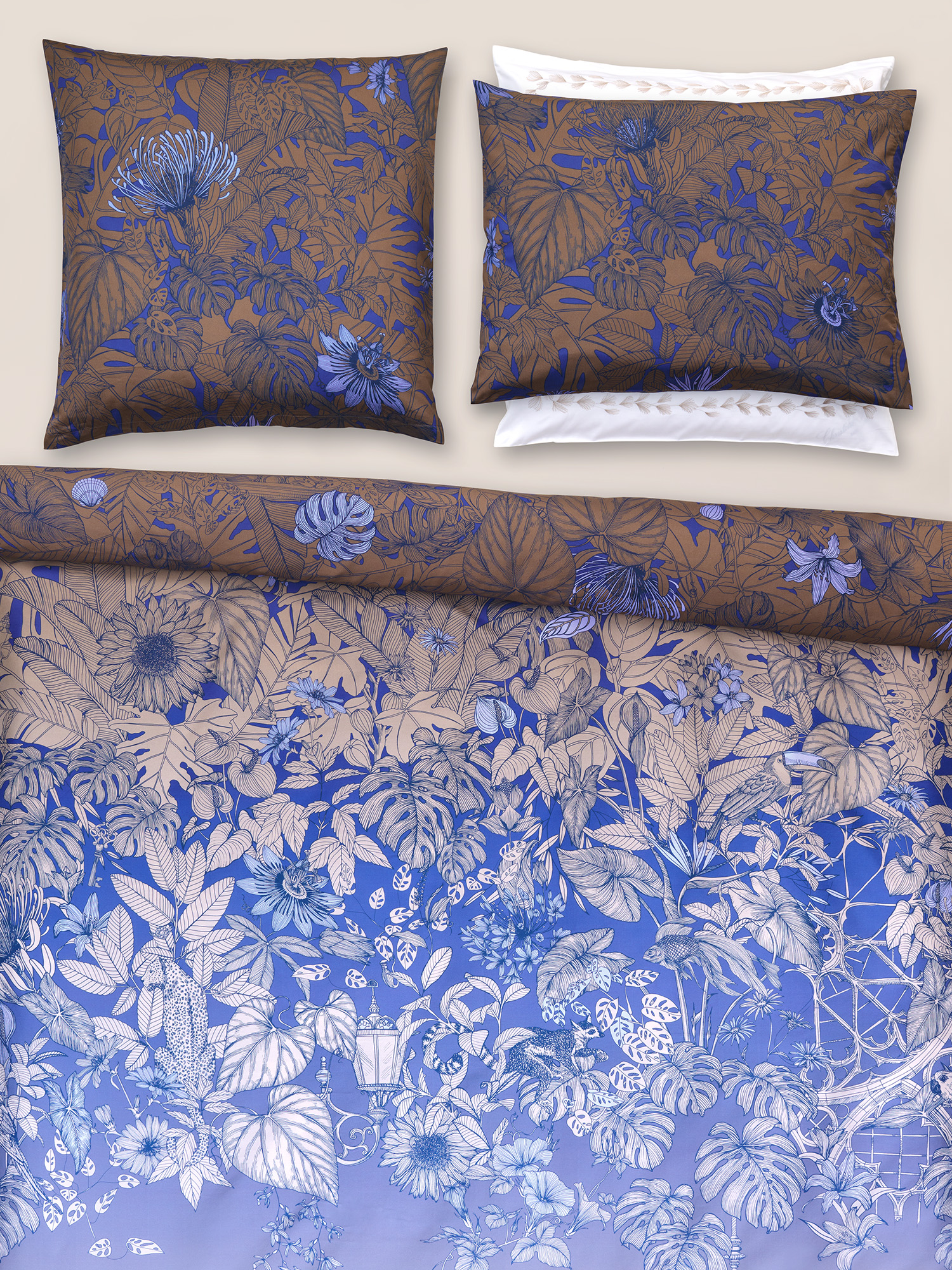 Der elegante Farbverlauf, von Nachtblau bis hin zu zartem Sand, ist inspiriert von den neuesten Trends der Mode und des Lifestyles. Dieser einzigartige Farbverlauf ist eine Rarität in der Welt der Bettwäsche.