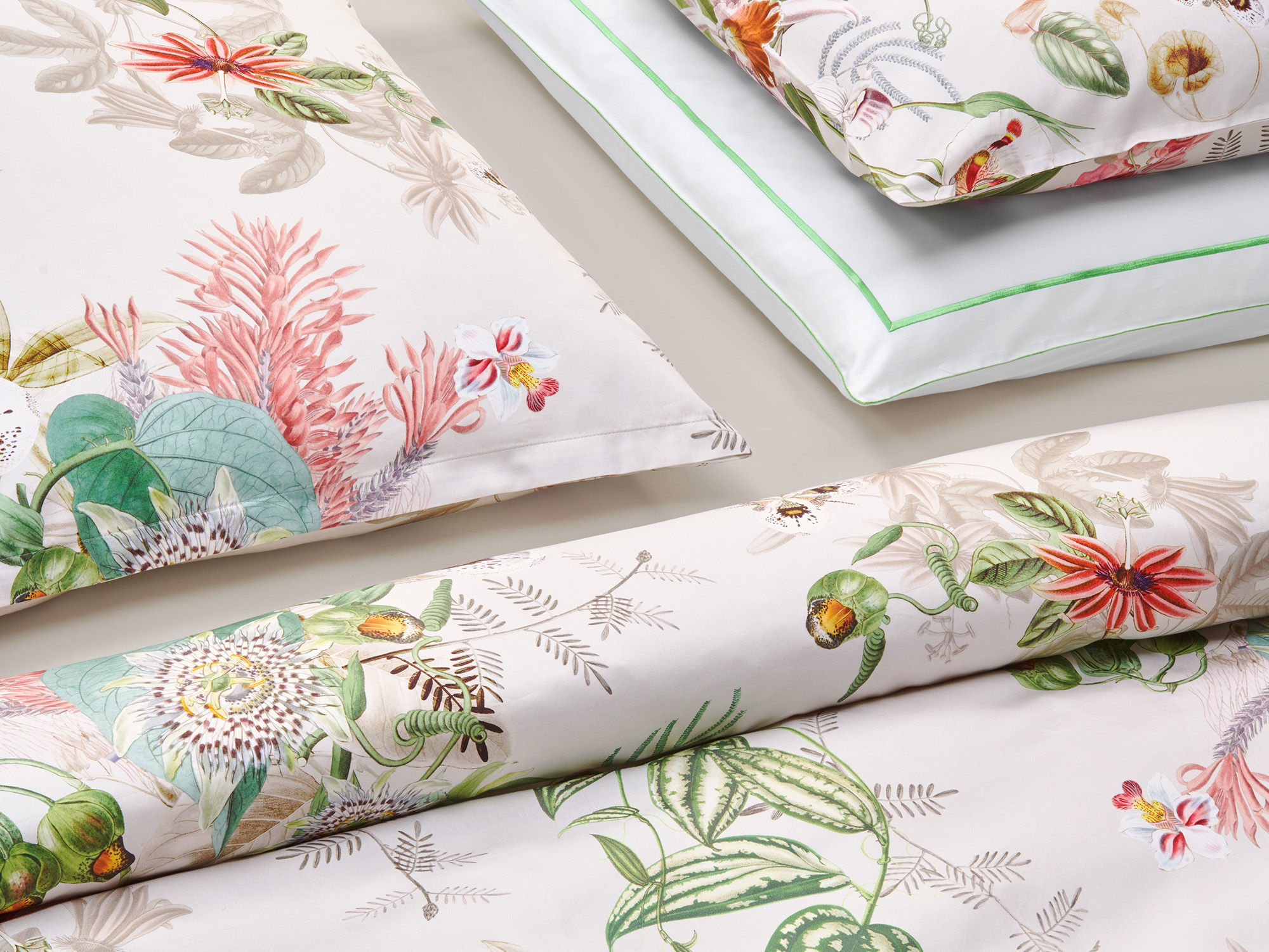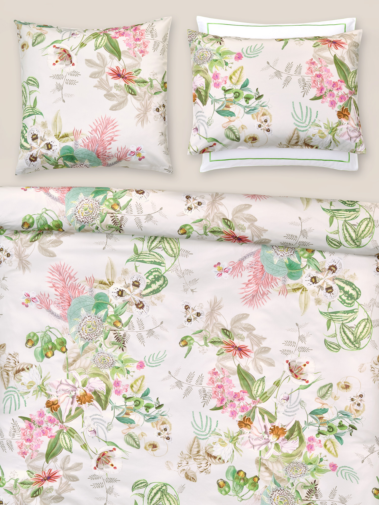 BOTANIC - Ein Meisterwerk der zeitgenössischen Blumenkunst. Hier erstrahlen zartrosa Orchideen, leidenschaftliche Passionsblumen und majestätische Schwertlilien auf einem Bett aus sanftem Beige.