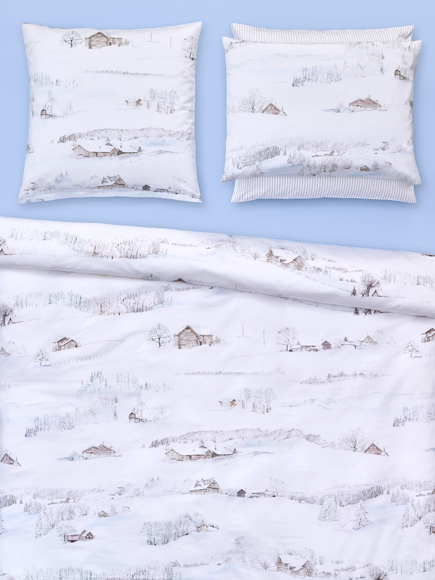 Vor Ihnen erstrecken sich schneeweisse Landschaften, begleitet vom gedämpften Knirschen der Fussstapfen im Schnee. Zwischen den sanften Hügeln thronen heimelige Chalets und gemütliche Bauernhäuser. Die mit Bleistift gezeichneten Motive verleihen dem Design WHITE SEASON eine warme, erzählerische Aura.