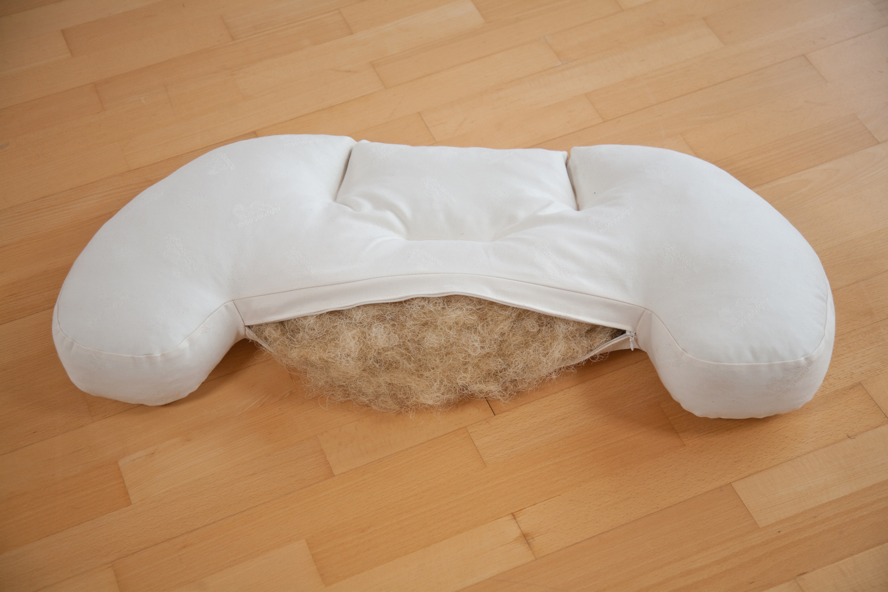 Der Bogen auf beiden Seiten ist optimal für die Embryolage. Der Kopf liegt auch in eingerollter Seitenlage stabil auf dem Kissen. Der Bogen entlastet die Schulter und gibt ihr Halt. Auch eine persönliche Ohrmulde können Sie sich leicht zurecht richten. Das Nackenkissen ist als Ganzes waschbar und kann nach langjähriger Benutzung wieder aufgearbeitet werden.