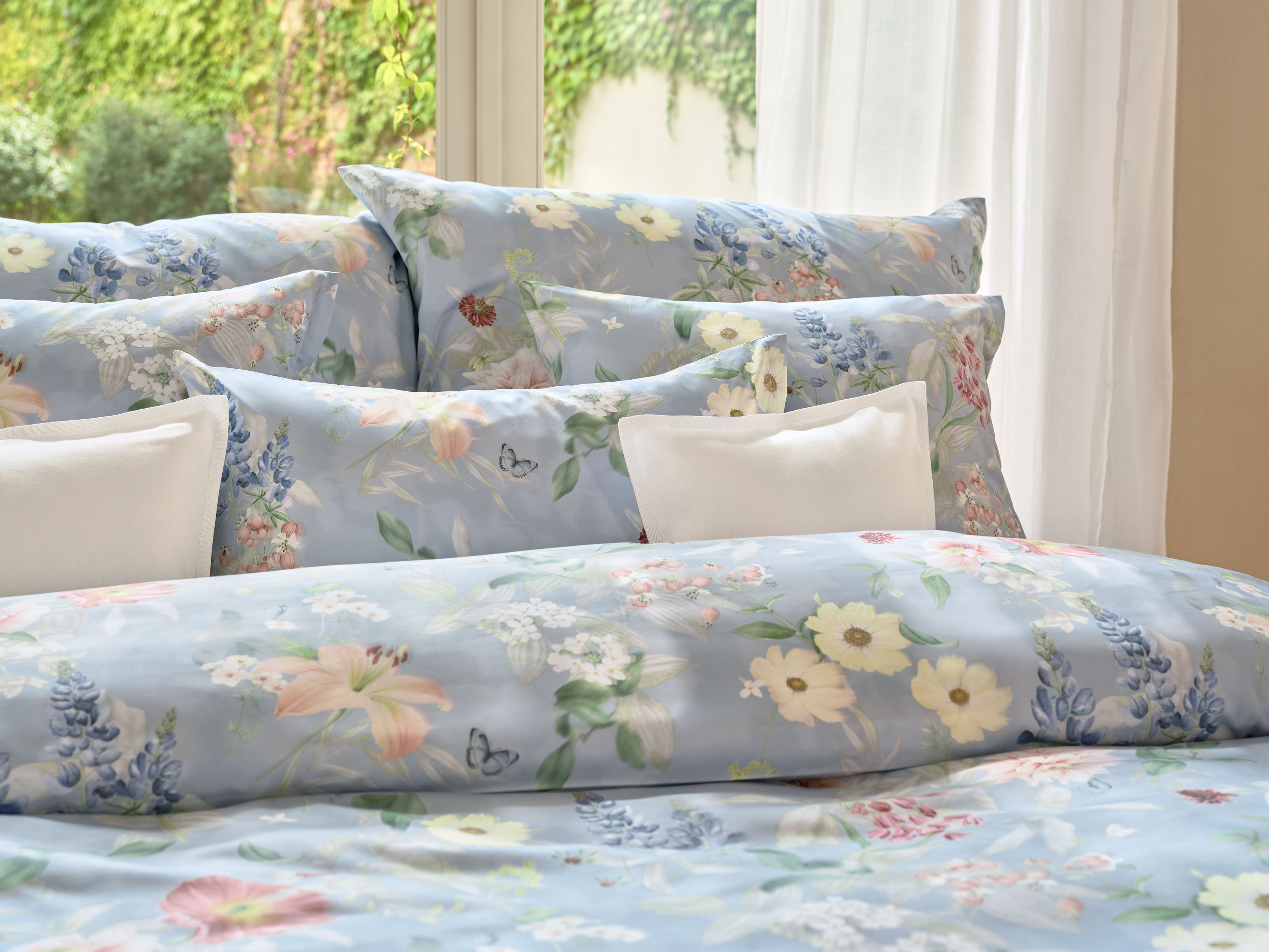 Sanft wippen die Blüten und Blätter hin und her oder tänzeln gemeinsam mit den kleinen Schmetterlingen durch die Luft – wo sie auf den nächsten Windstoss treffen, da verwischen sich die Farben der Motive. AVEN ist ein vielschichtiges Design mit einer Mischung aus Aquarell- und Bleistiftzeichnungen und einem zarten, flächigen Muster im Hintergrund.