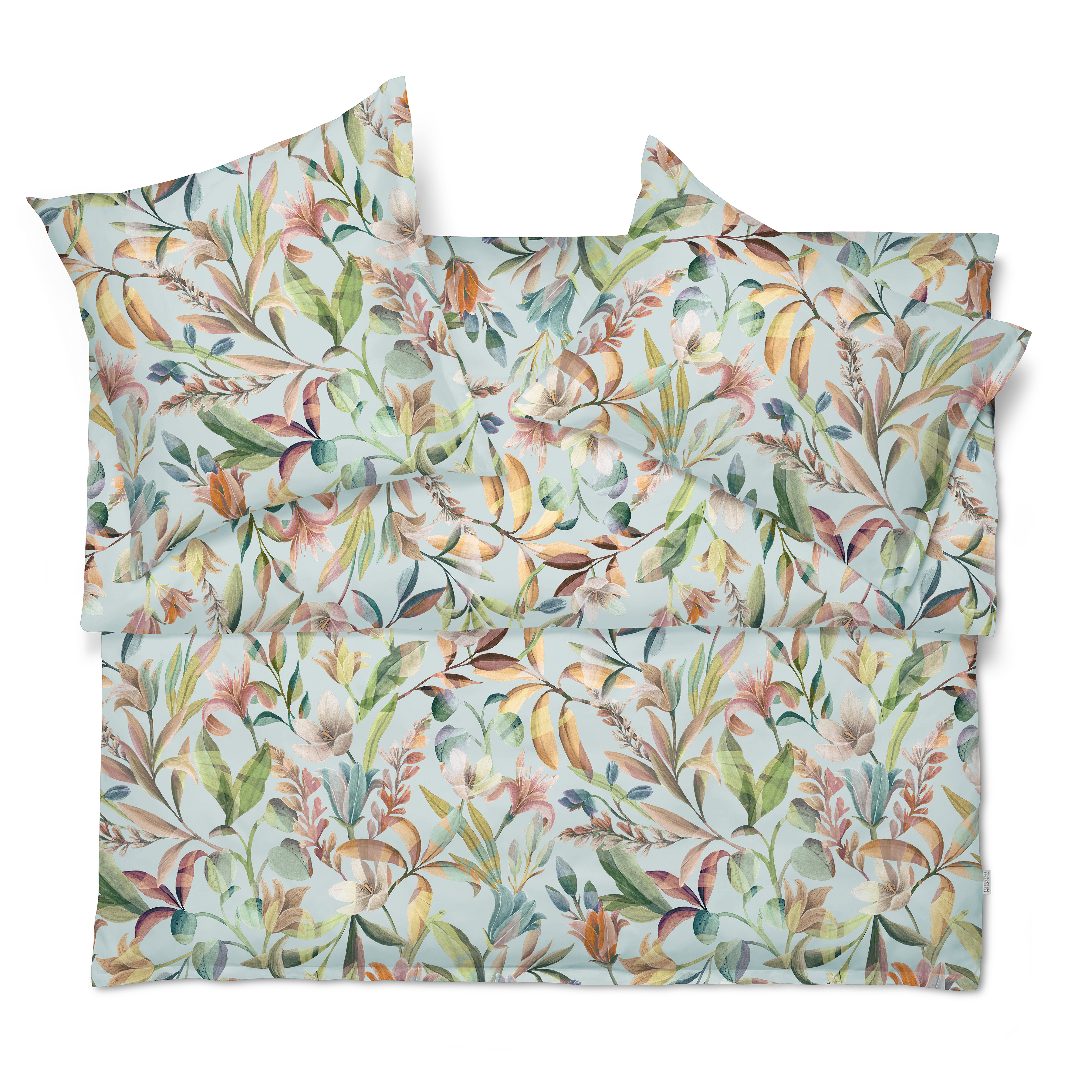 Dieser Goldlichtmoment auf der Bettwäsche ADÈLE, wie er doch den Herbst mit seiner dezenten Opulenz ankündigt und genau diese facettenreiche Atmosphäre der Pracht und Fülle einfängt. Ein nuanciertes Farbspiel aus schimmernden Sonnenstrahlen und mit leicht gefrorenem Tau überzogene Blattwerk bringt die gedeckten Herbsttöne auf dem Blattgrün hervor, während das blühende Farbparadies in seinem ganz eigenen dramatischen Charakter ruht. ADÈLE ist gezeichnet in Aquarell und verewigt auf salbeigrünem Fond.