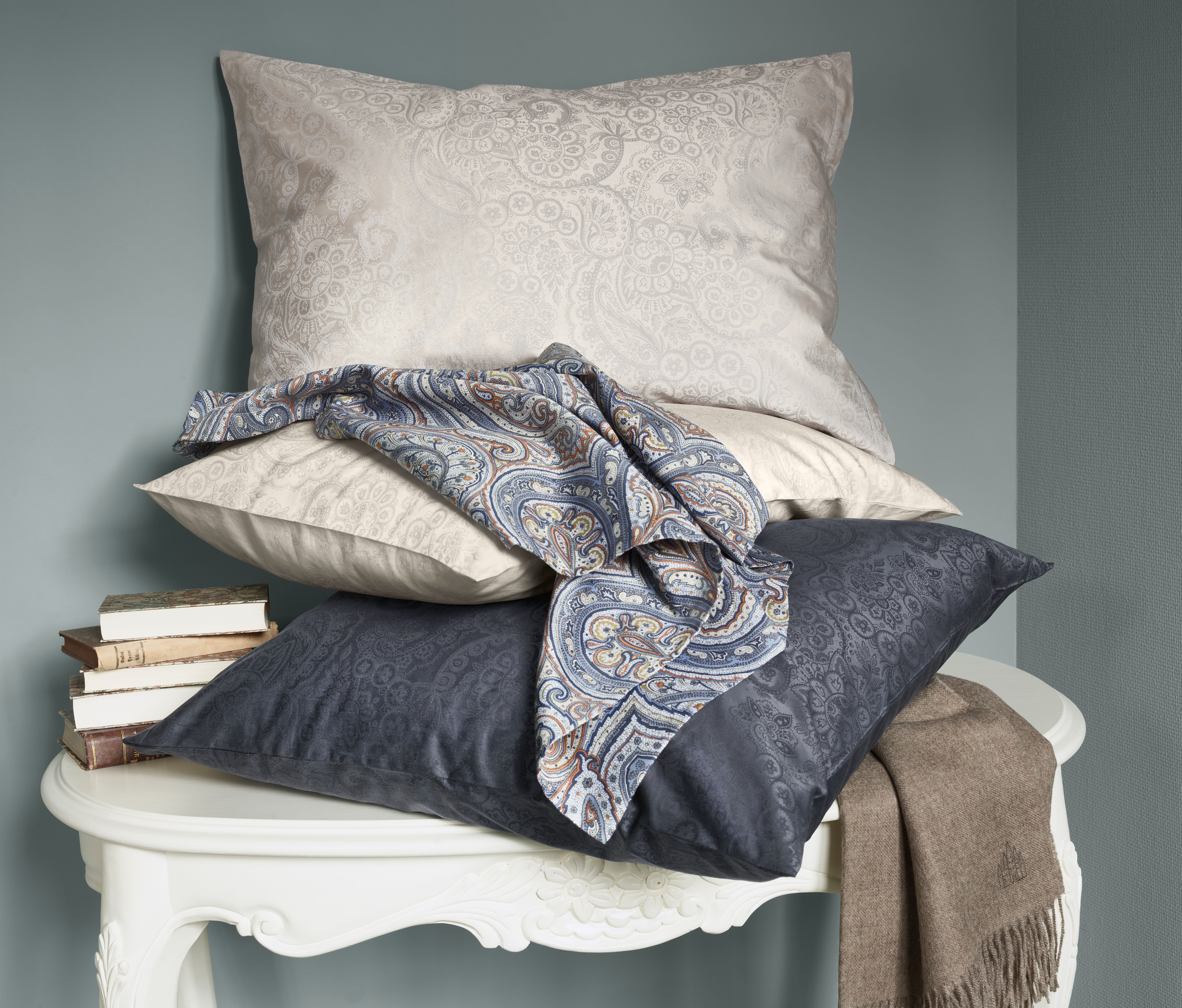 Das Bettwäsche-Design TALIS präsentiert sich in den drei Farbstellungen Bleu, Beige und Ecru als elegantes Paisley Muster in edlem Jacquard Gewebe. Je nach Lichteinfall entfalten sich die raffinierten Farbschattierungen im edlen Matt-Glanz-Effekt und faszinieren die stillen Betrachtenden bei jedem Anblick neu.